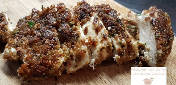 Doe een soeplepel brood en zet de kipfilet bovenop.