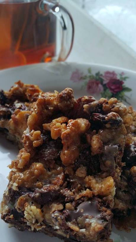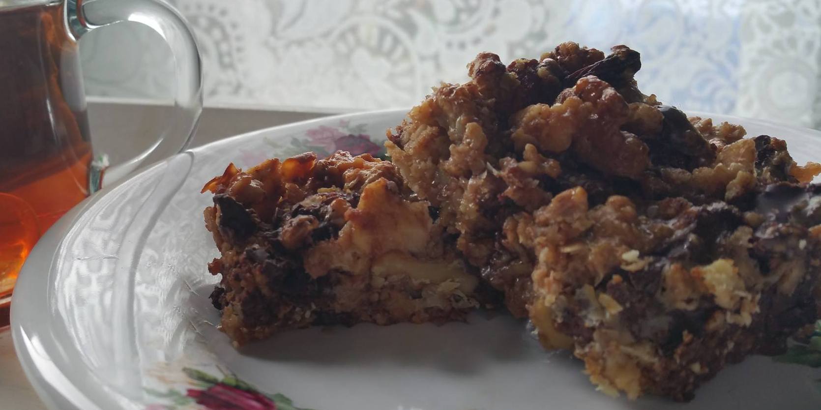 Lekker zelfverzonnen recept van een tussendoortje met Cruesli, chocolade, noten en fruit.