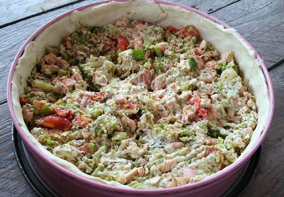 Giet het Broccoli mengsel in het springvorm, over het Danerolles deeg.