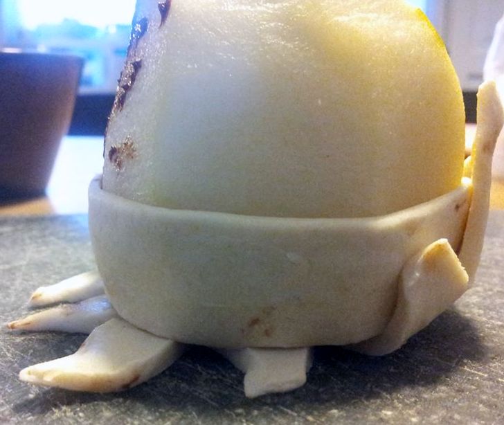 Snijd in een ander plakje, repen van 1 cm en leeg ze rond de peer tot boven.