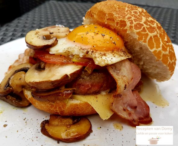 Doe een ei erop en schep 2 lepels champignons bovenop.