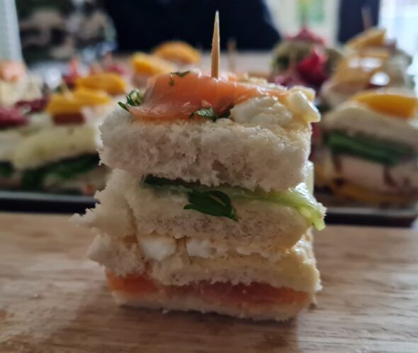 Snijd in de diagonale en nog een keer in diagonale. Prik de mini sandwishes met cocktailprikkers.
