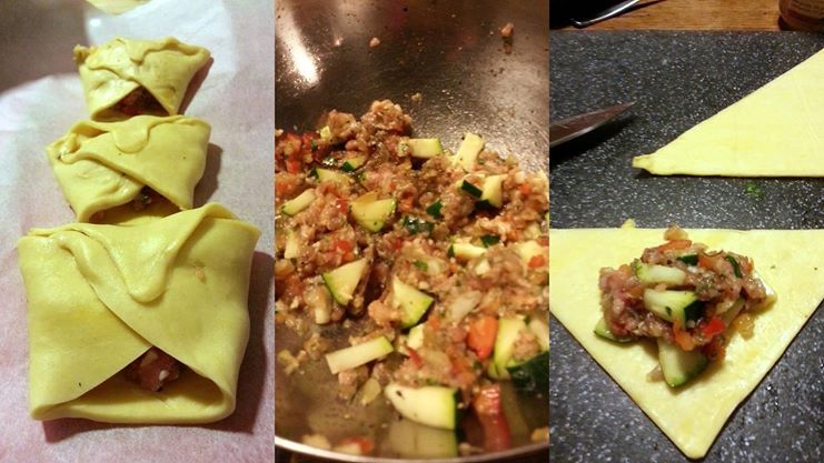 Leg op elk plakje bladerdeeg wat van het gehaktmengsel.