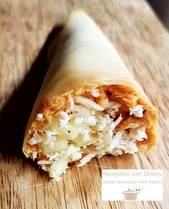 Vul de filodeeg met een theelepel kip-appel mengsel.