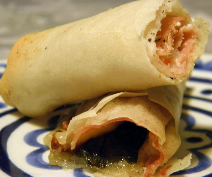 Verdeel de vulling over de stukken filodeeg, breng op smaak met peper en rol ze op en sluit de randjes met wat water.