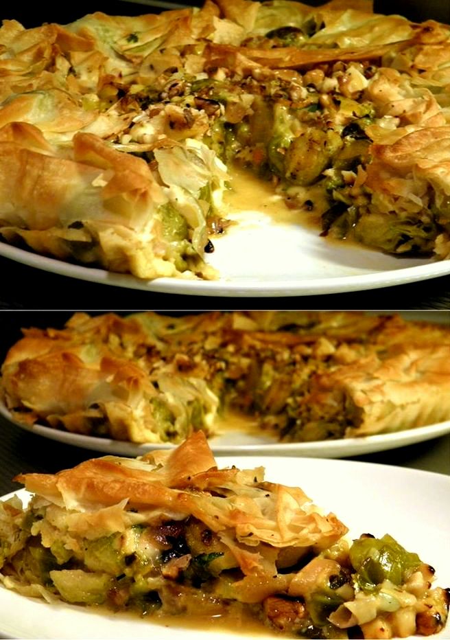 Eerst, heb ik een recept met spruitjes in de wok gebruikt en daarna een recept van filotaart met groenten.