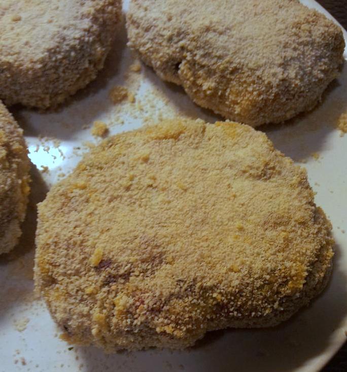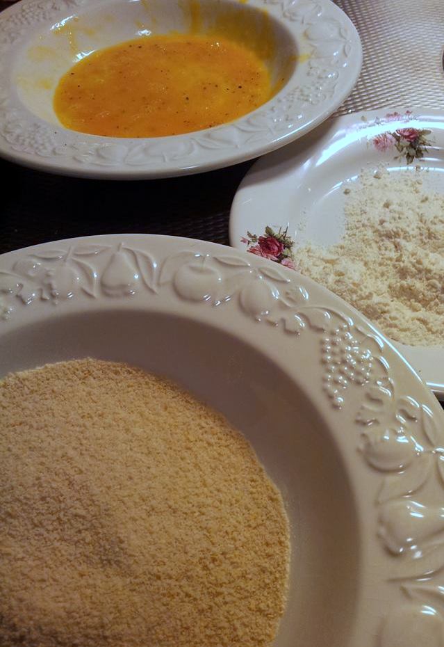 Dop de burgers een per een, eerst in de bloem, daarna in de ei en daarna in de paneermeel.