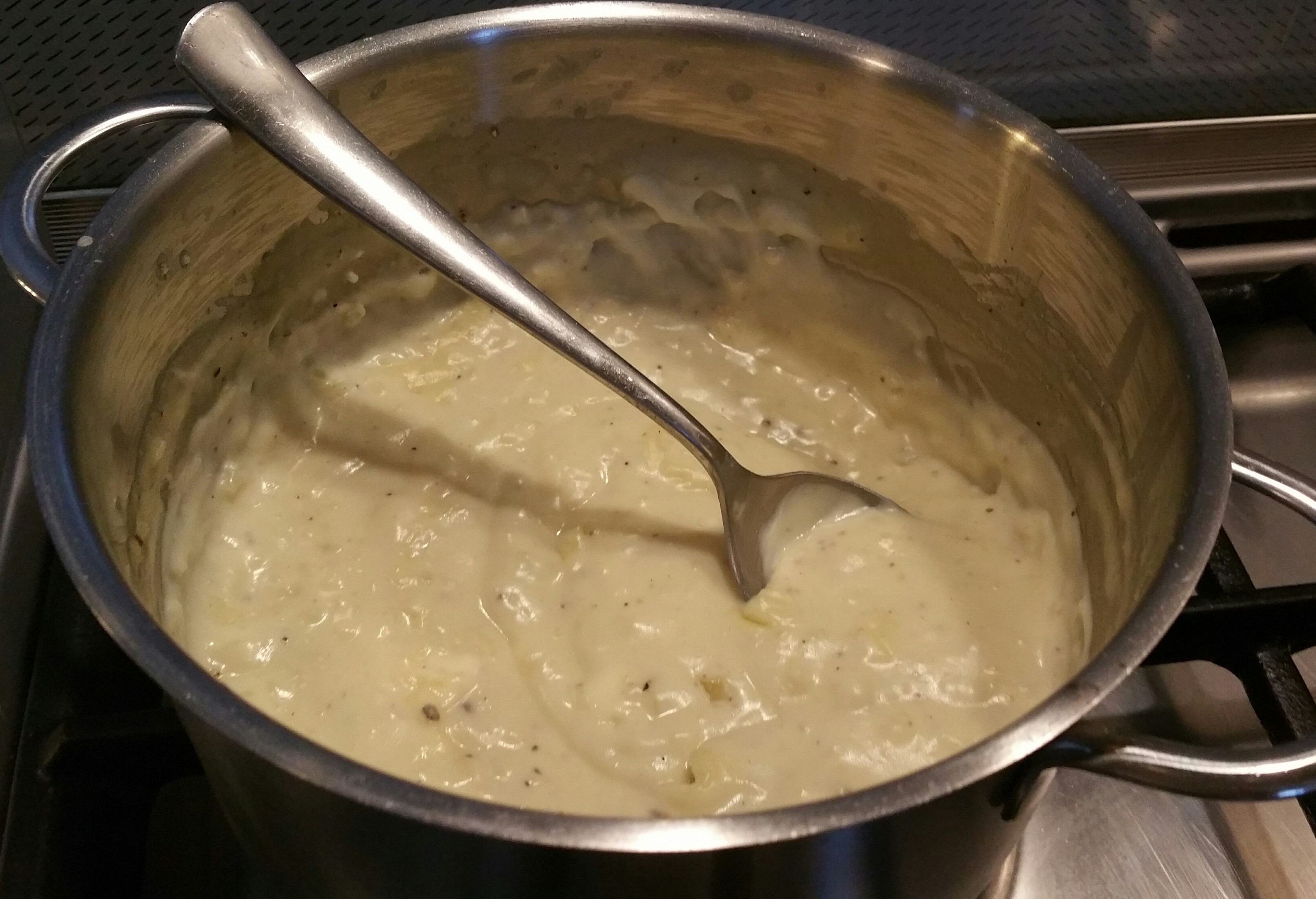 Voeg op laag vuur al roerend met een garde de melk in scheuten toe.