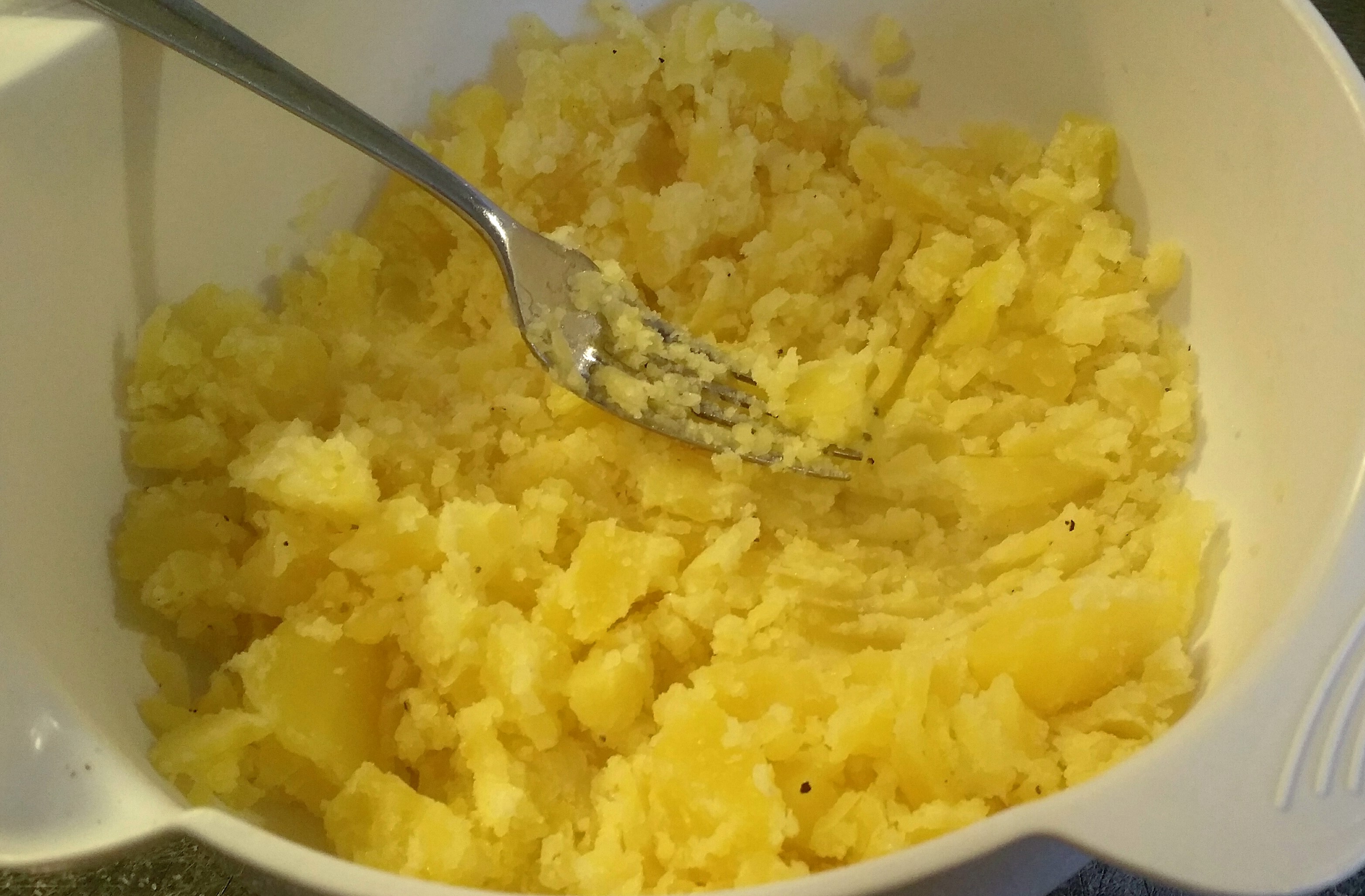Doe de aardappelen in een kom, breng ze op smaak met peper en zout en prak ze grof met een vork.