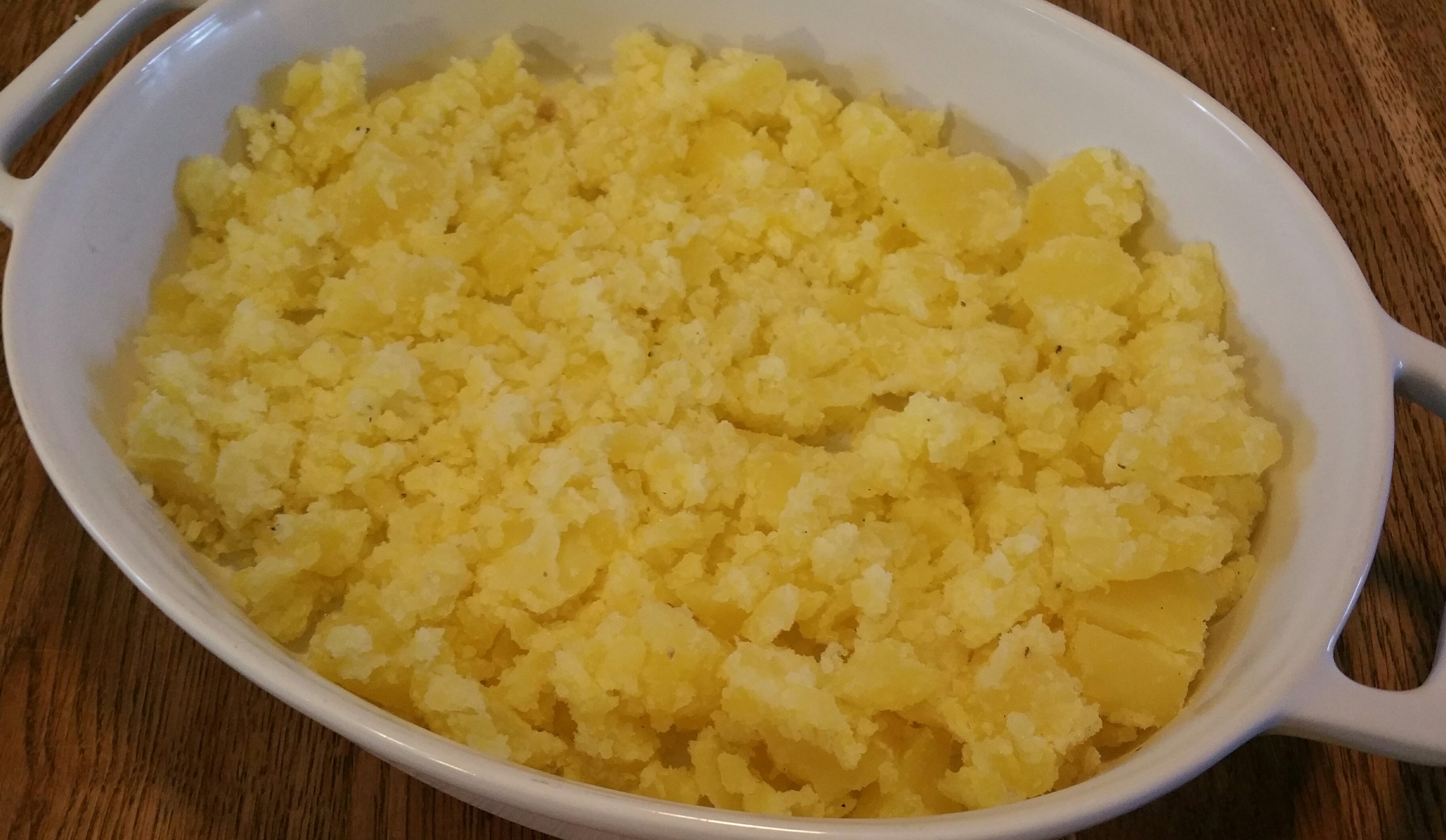 Verdeel de geprakte aardappelen in een ovenschaal.