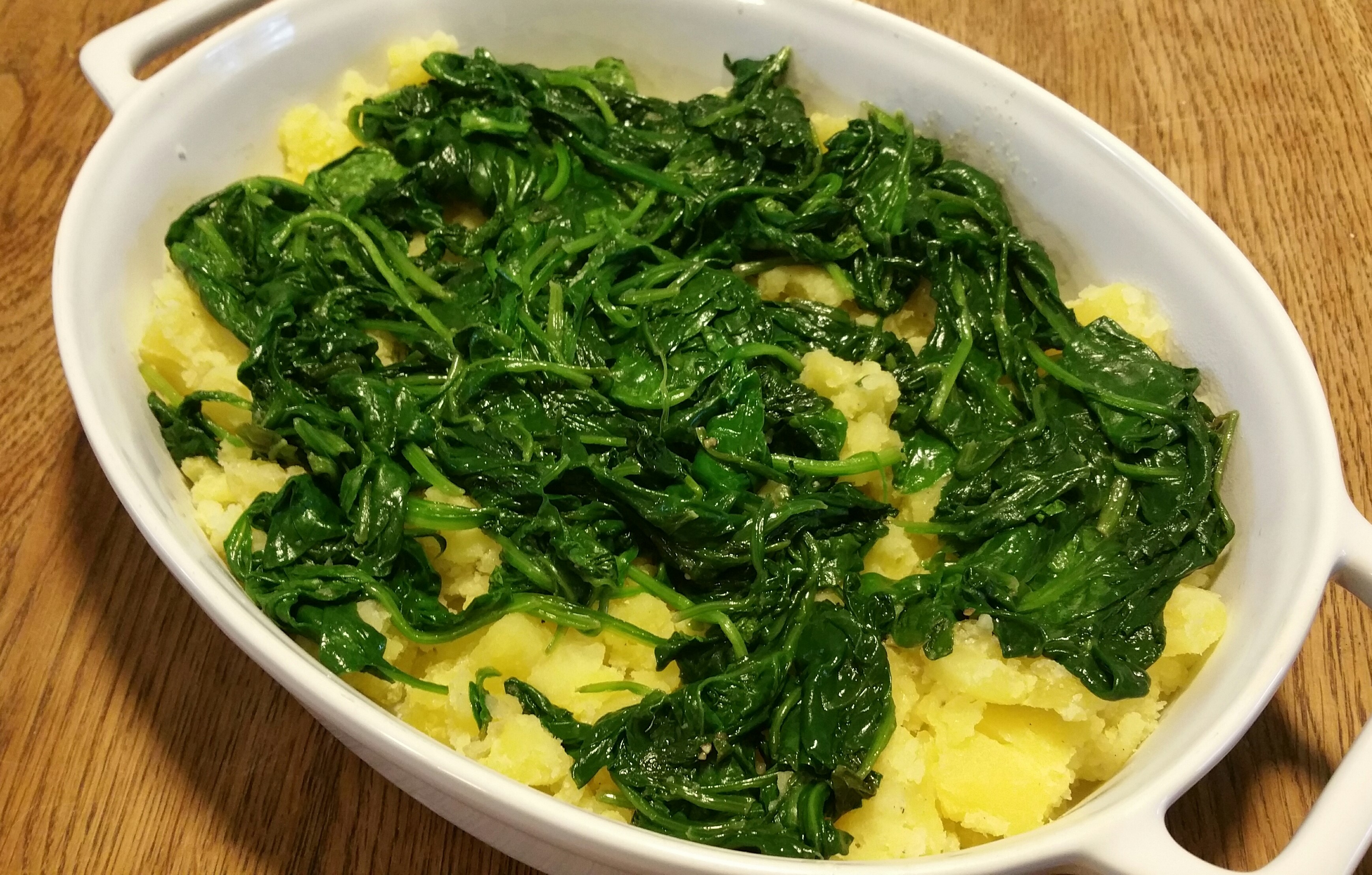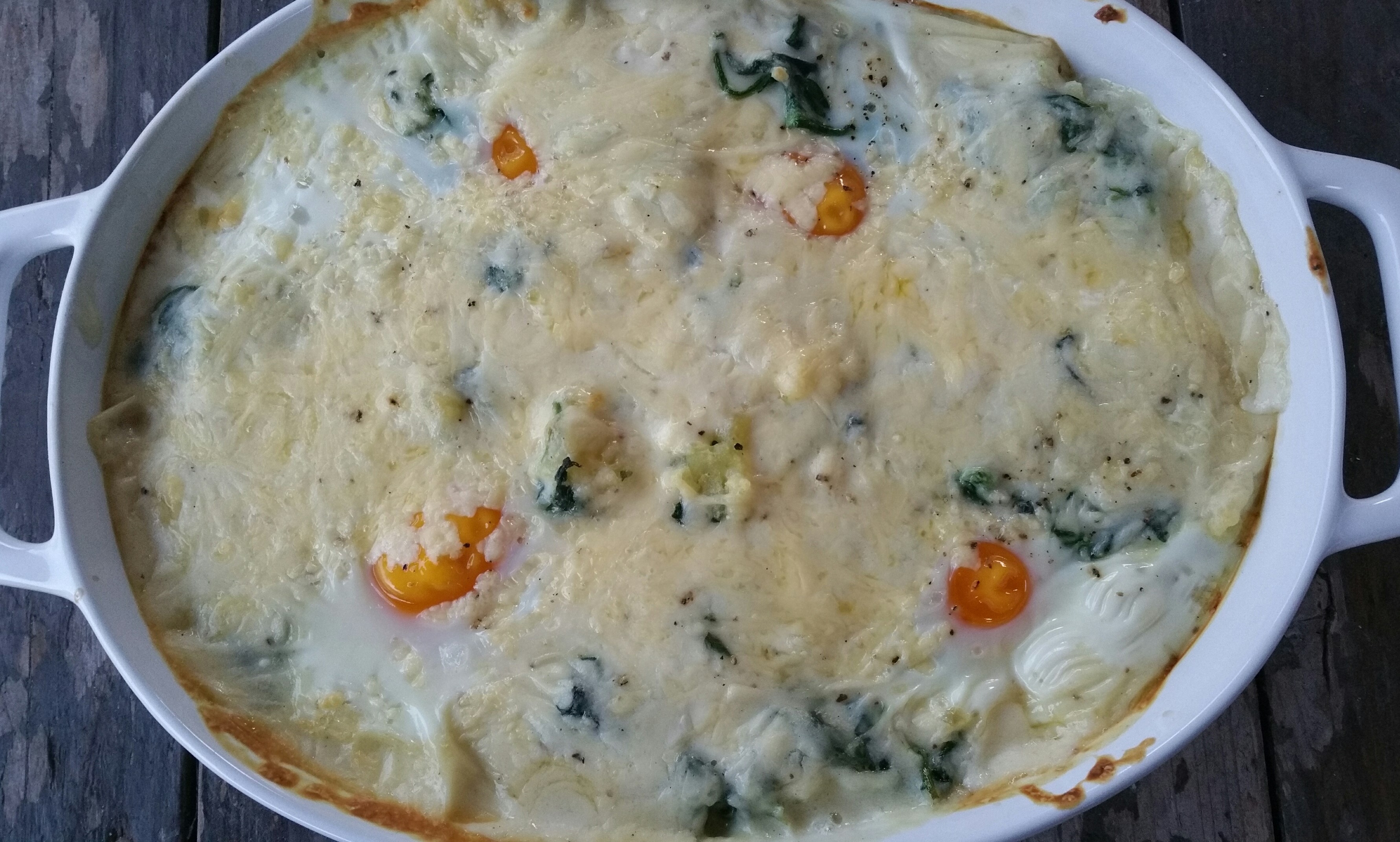 Ik heb het recept aangepast door 1 ui en knoflook in de Bechamel te doen en door een bedje van gekookte aardappelen onder de spinazie te doen.