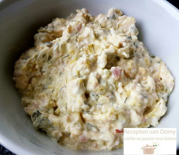Meng het prei-appel mengsel samen met het ei, het peterselie-ham mengsel, mayonaise en yoghurt en breng goed op smaak met peper en zout.