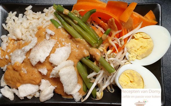 Gado gado komt van de Javaanse woord “nggadho”, dat betekent ” eten met witte rijst”.