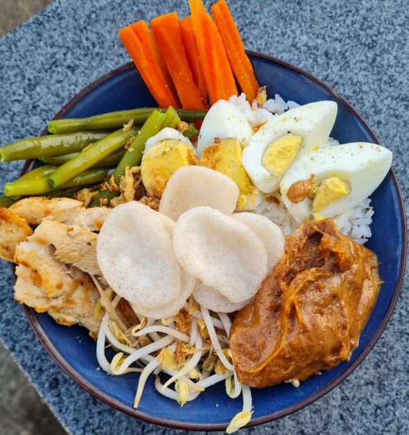 Eventueel voeg wat melk of wat pindakaas toe als het nodig is.