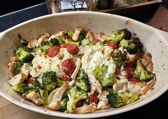 Meng de tomaatjes, de kip, de kaas en de broccoli goed samen.
