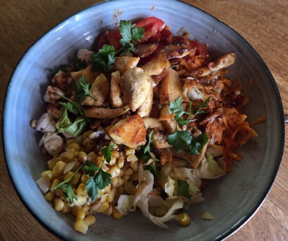 Die de dressing in de middel, strooi wat pijnboompitten en amandelen plakjes en wat peterselie erop.
