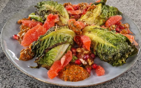 Serveer de gem met de Muhammara dip, granaatappel, bacon, noten en plakjes grapefruit.