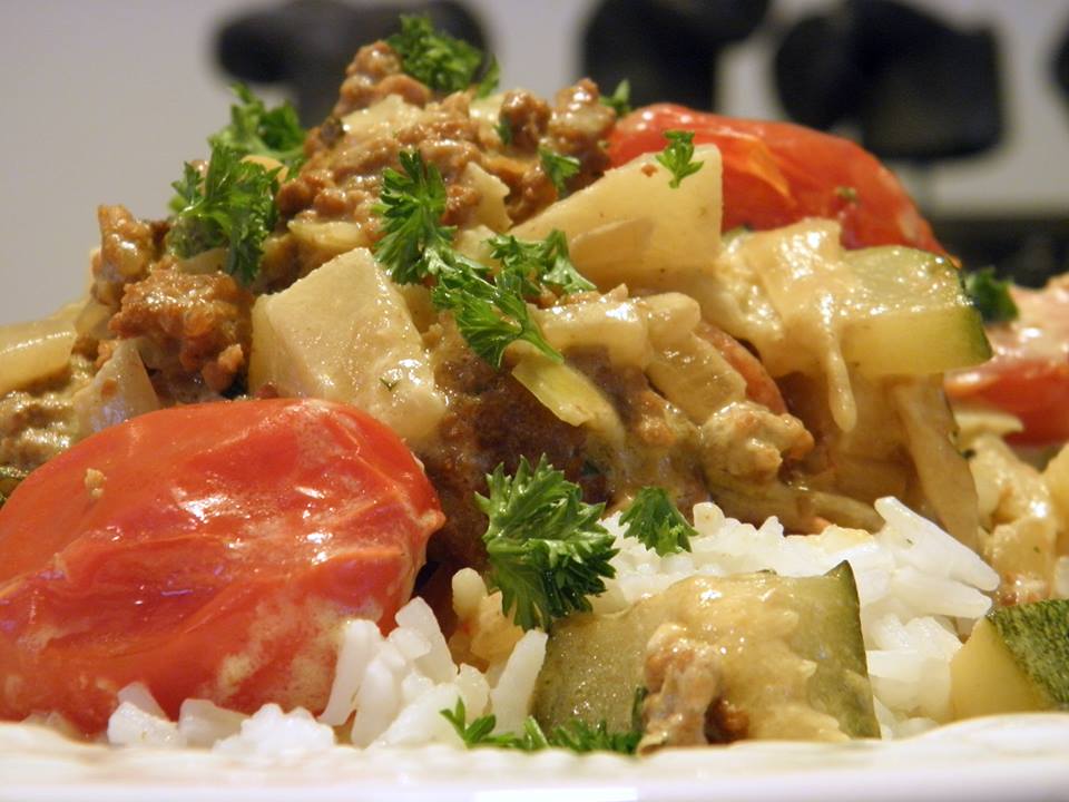 Voeg dan de courgette, de paprika, de ananas blokjes, de prei, de kerrie poeder, de peterselie en basilicum toe.