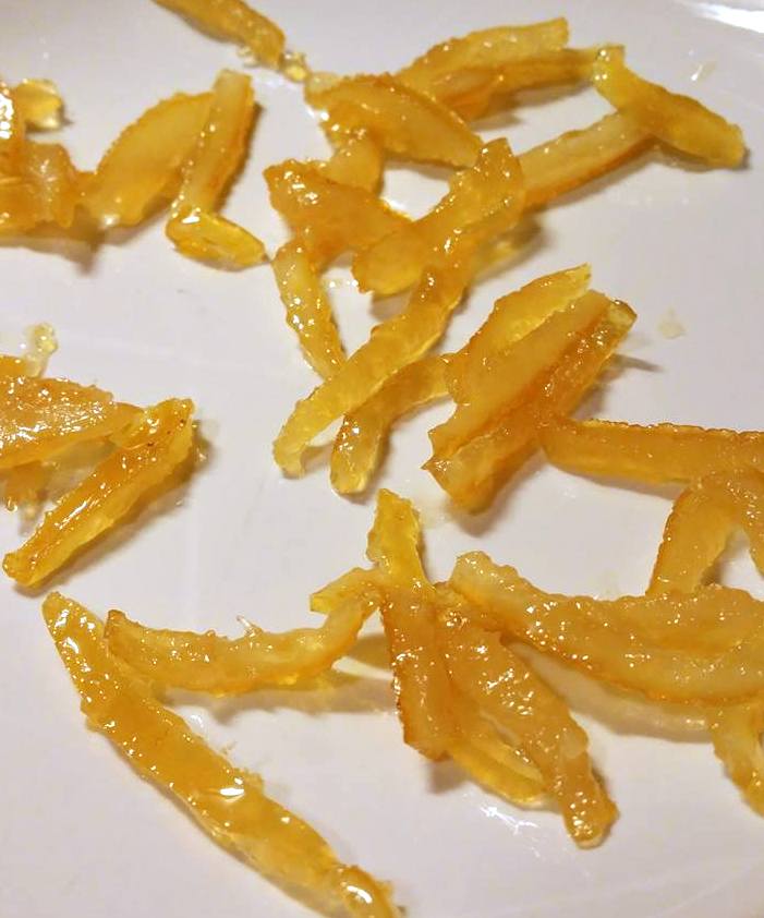 Doe de reepjes schil weer in het pannetje, voeg de suiker en het water toe. Breng aan de kook en laat op laag vuur inkoken tot het suikerwater verdampt is. De reepjes zien er nu ‘glazig’ uit.