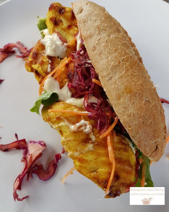 Beleg de pistolets naar smaak met mayonaise, plakjes kipfilets, peen julienne, rode kool salade en sla.