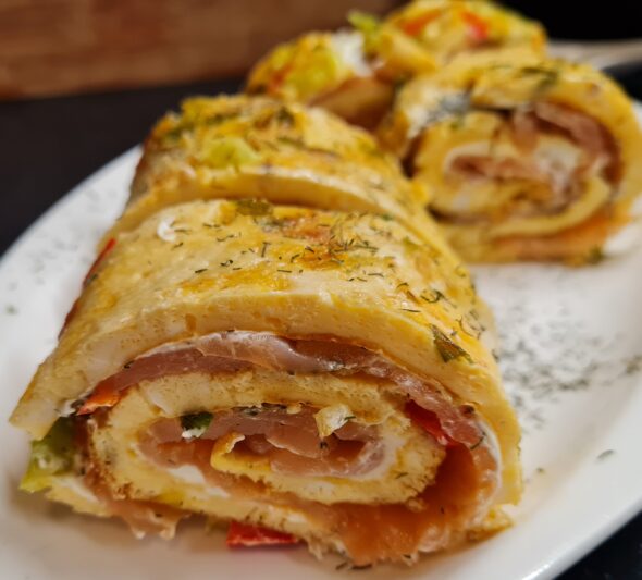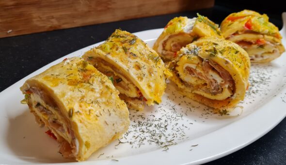 Snijd de omelet in plakjes en zet ze op een mooie serveerschaal.