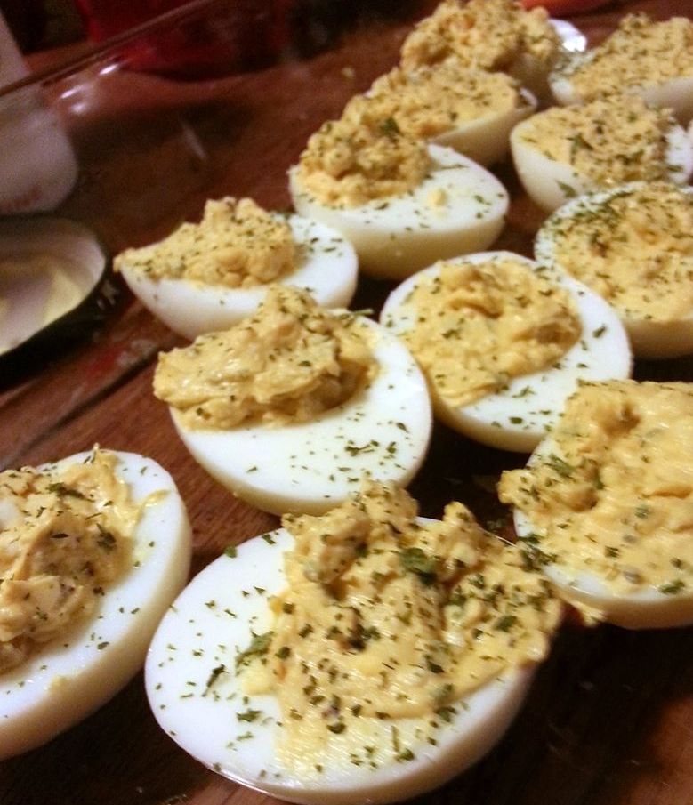 Snijd de eieren in de lengte door midden en haal de eidooiers eruit.