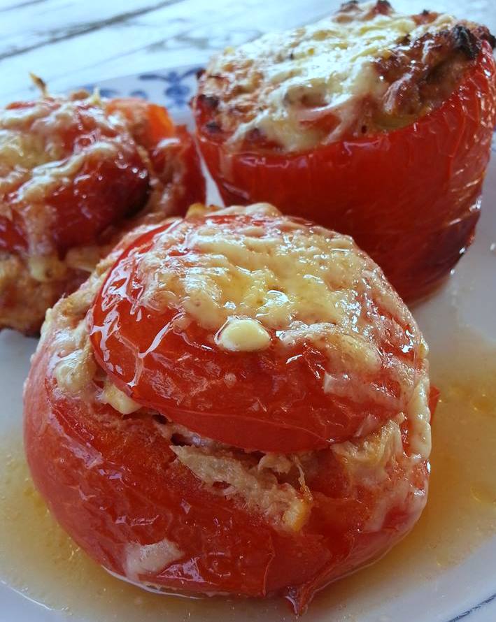 Vul de tomaten en de paprika’s met het mengsel.