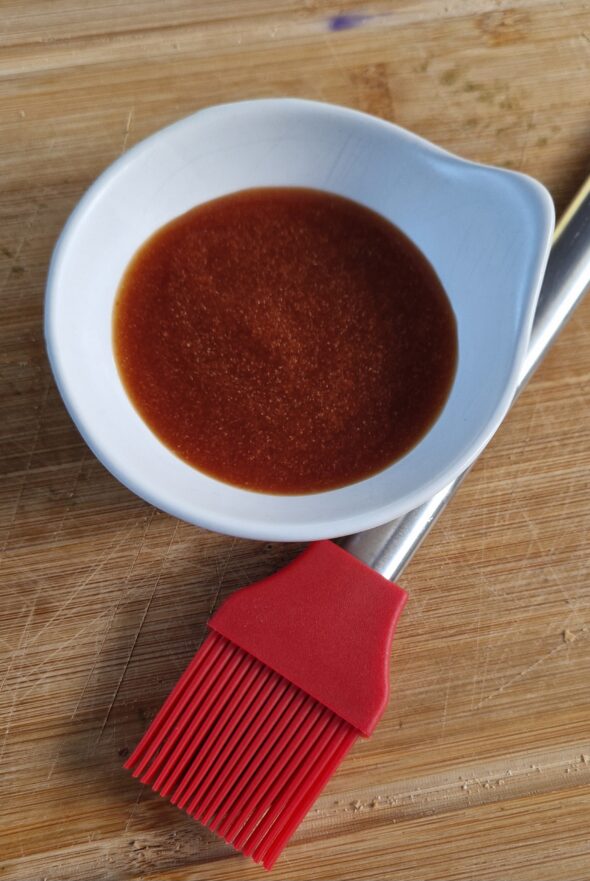 Met een kwast ef een bbq mop, smeer de glaze op het vlees, 10 minuten en daarna 5 minuten voor de eind.