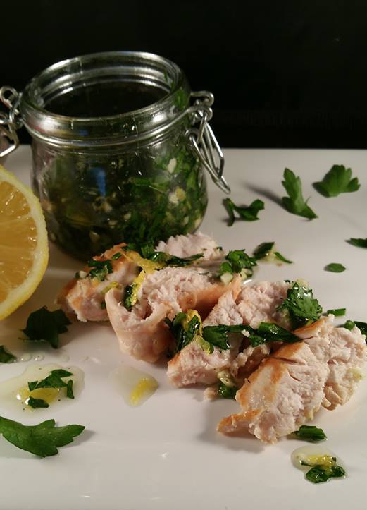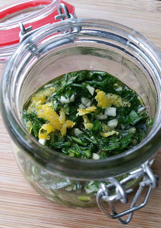 Meng samen het citroenrasp met de knoflook, de peterselie en de olijfolie. Breng op smaak met peper en zout.