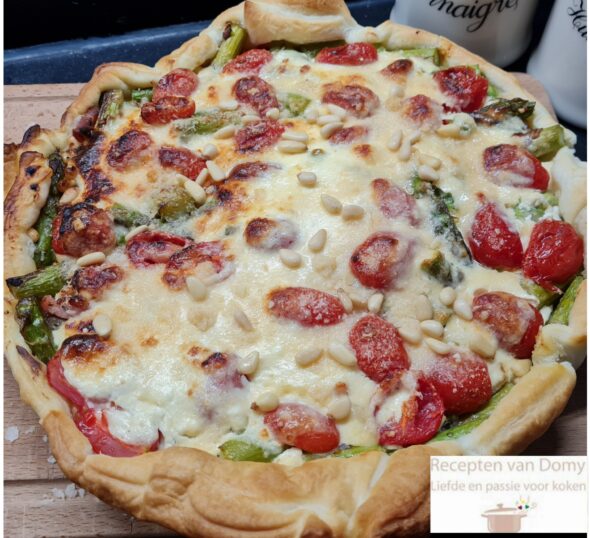 Zelfverzonnen luchtige taart met asperges, spekjes en tomaatjes.