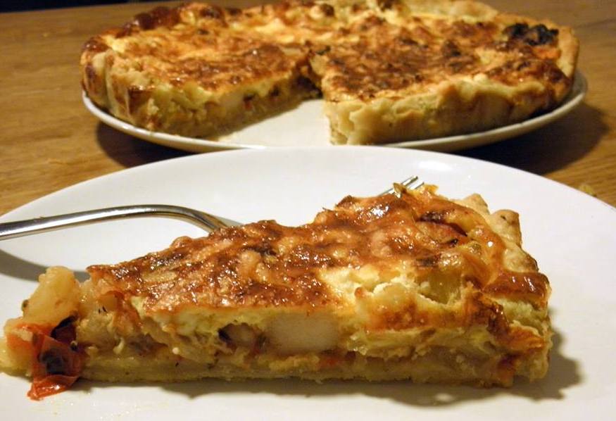 Klop de ei los met de koffiemelk, zout en peper en giet het in de taart.