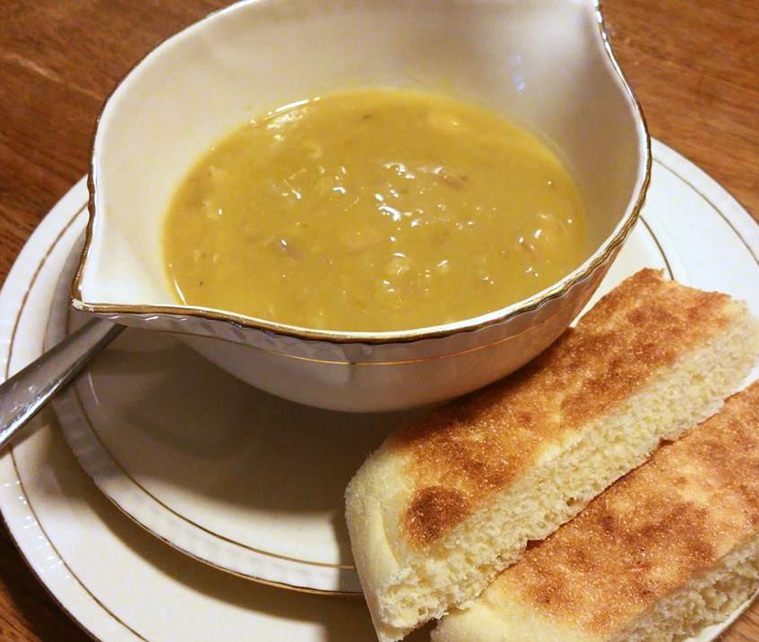Als je rookworst gebruikt, kook hem 20 minuten met de soep, haal hem uit de pan, snijd in plakjes en roer deze door de soep.