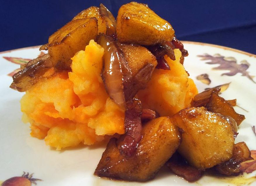 Stamp de aardappelen en de appels samen met wat warm melk fijn.