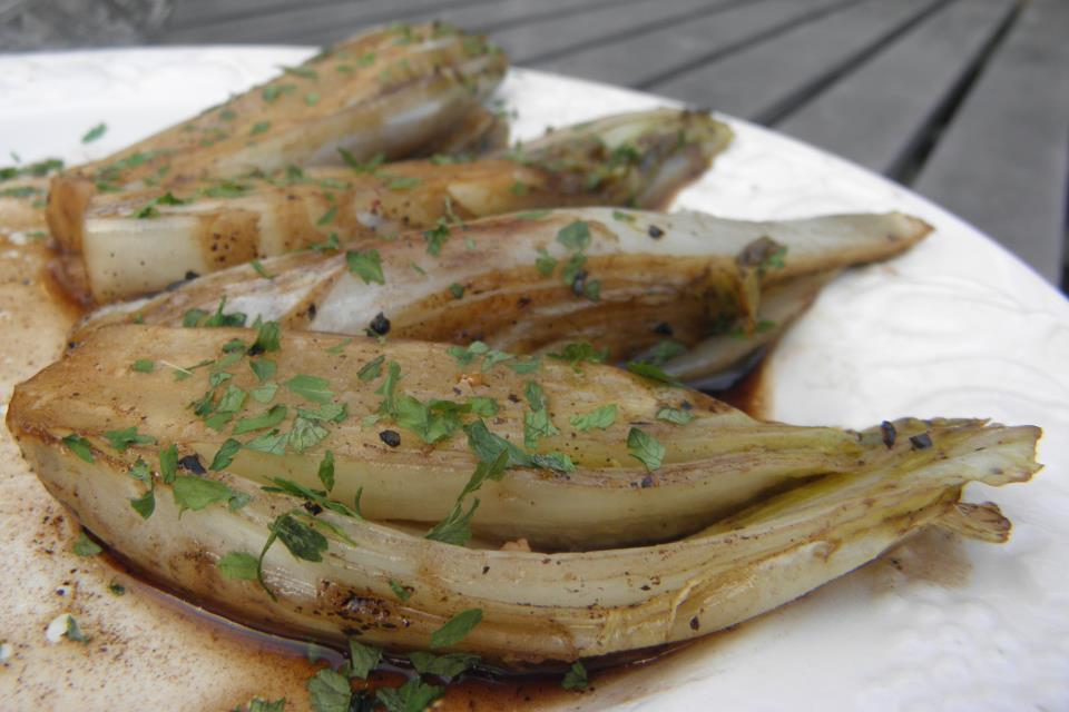 Regelmatig voorzichtig keren. Blus het geheel af met de balsamico en laat nog 10 minuten stoven op het vuur. Draai de witlofjes goed door de balsamico.
