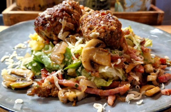 Serveer meteen 2 gehaktballen per persoon en 2 eetlepels van het spekjes champignons mengsel bovenop.