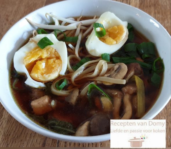 Garneer met 2 lepels bos uitjes, 2 lepels taugé en 2 halve eieren.