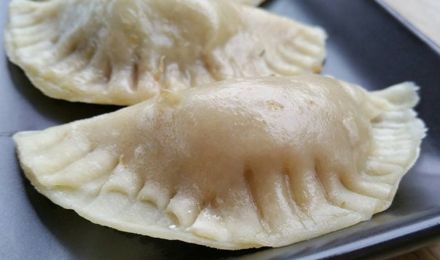 Met je vinger maak de rand van de dumpling nat. Vouw hem en met een vork, duw hem dicht (zie foto’s hierboven).