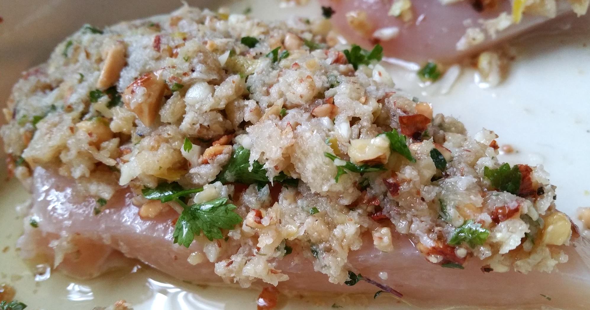Doe de knoflook, de rasp van de citroen, 1 theelepel citroensap, 1 theelepel olie, de brood, de walnoten, de amandelen, de peterselie en de tijm samen in een keukenmachine en hak ze samen (niet te fijn).