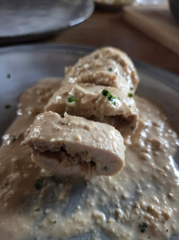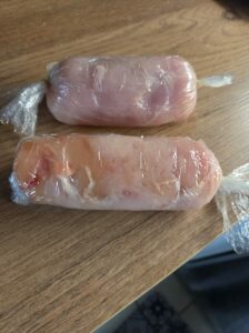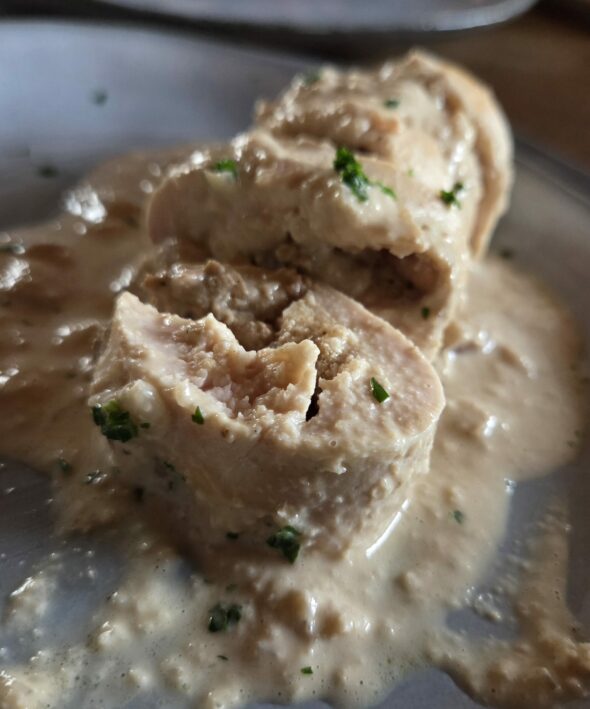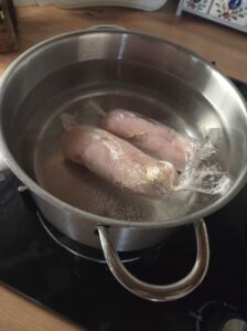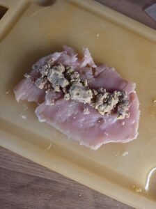 Kipfilet: leg er een vel bakpapier op en sla hem plat met een steelpan of een deegroller.Leg foie gras erop, rol strak op en pak in.