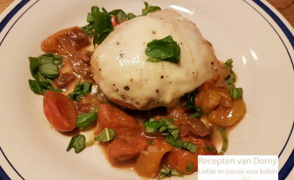 Leg op elke kipfilet een plak op 2 naast elkaar, zet de deksel op en laat de Mozzarella smelten.