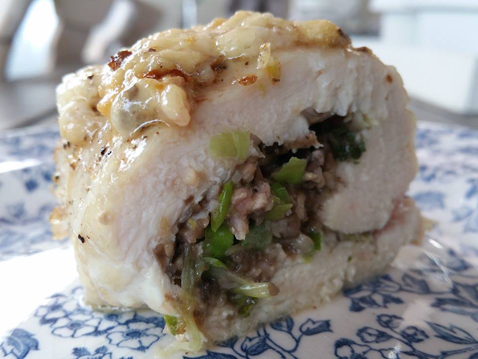 Rol de kipfilets op en maak ze dicht met 2 cocktailprikkers.