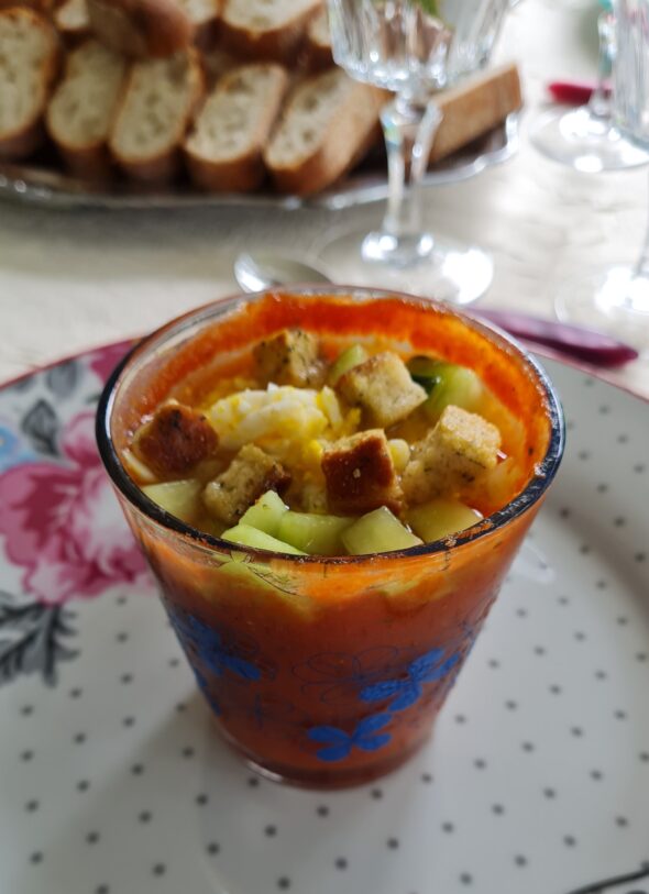 Zet op tafel de croutons, de komkommer en de eieren in kommetjes.