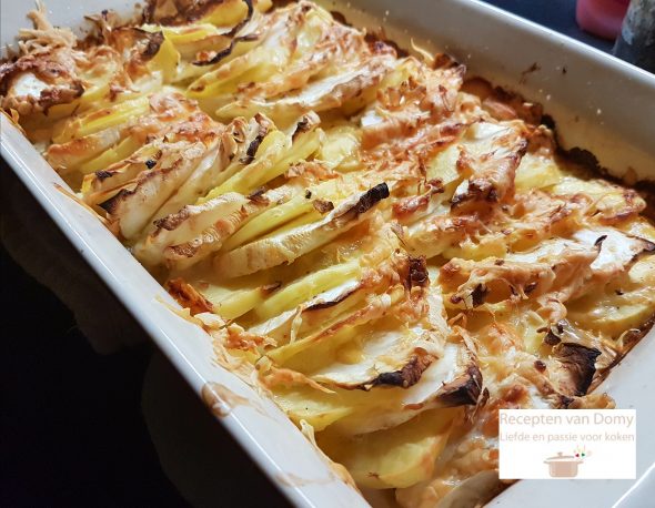 Zet de knolselderij en de aardappelen plakjes in de ovenschaal.