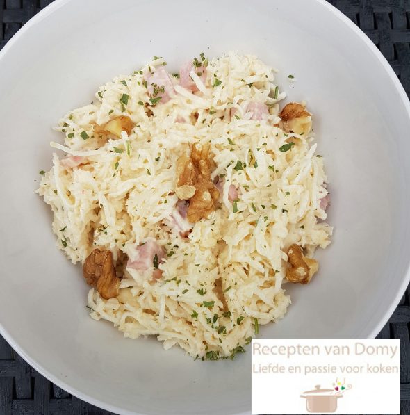 Voeg nu de ham blokjes en eventueel wat walnoten toe, doe een deksel op en laat 1 uur in de koelkast rusten.