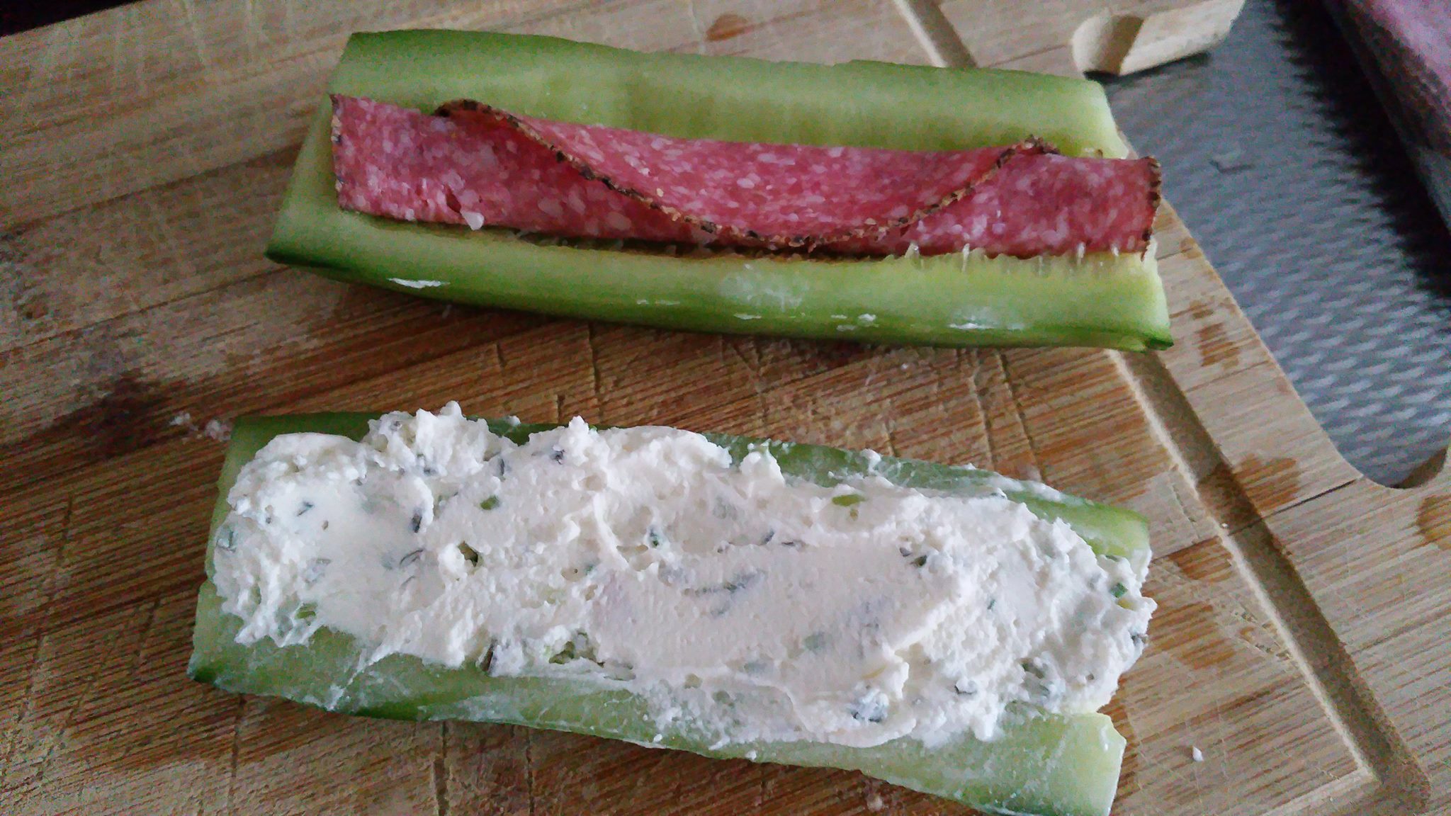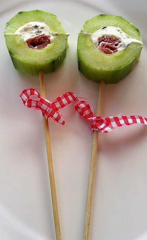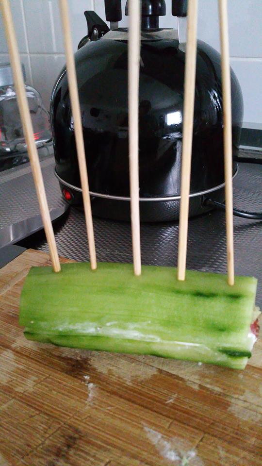 Leg de 2 stukken komkommer op elkaar en prik op 1 cm afstand spiesjes in de komkommer.