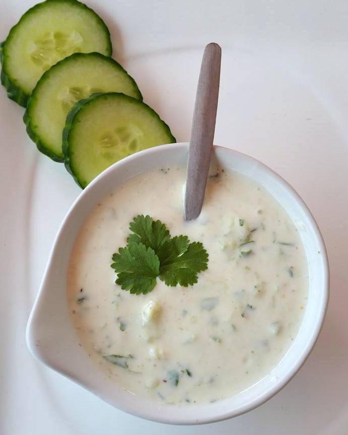Raita is een dipsaus die bij pikante gerechten wordt geserveerd.