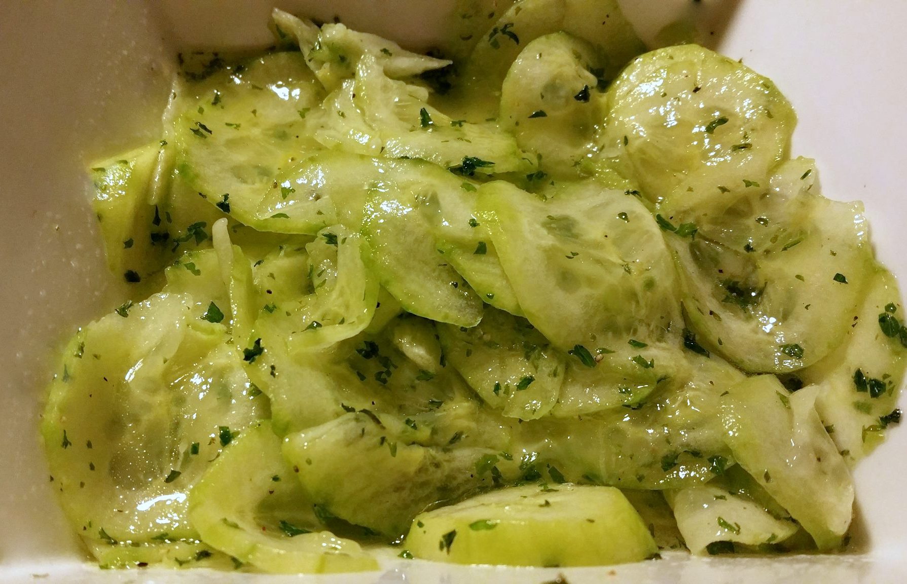 Meng de komkommer met de dressing en zet de salade 30 mn in de koelkast.
