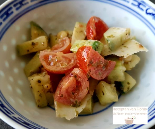 Meng nu de tomaatjes, de peterselie, de kaas, de pijnboompitten, de komkommer blokjes en de dressing.