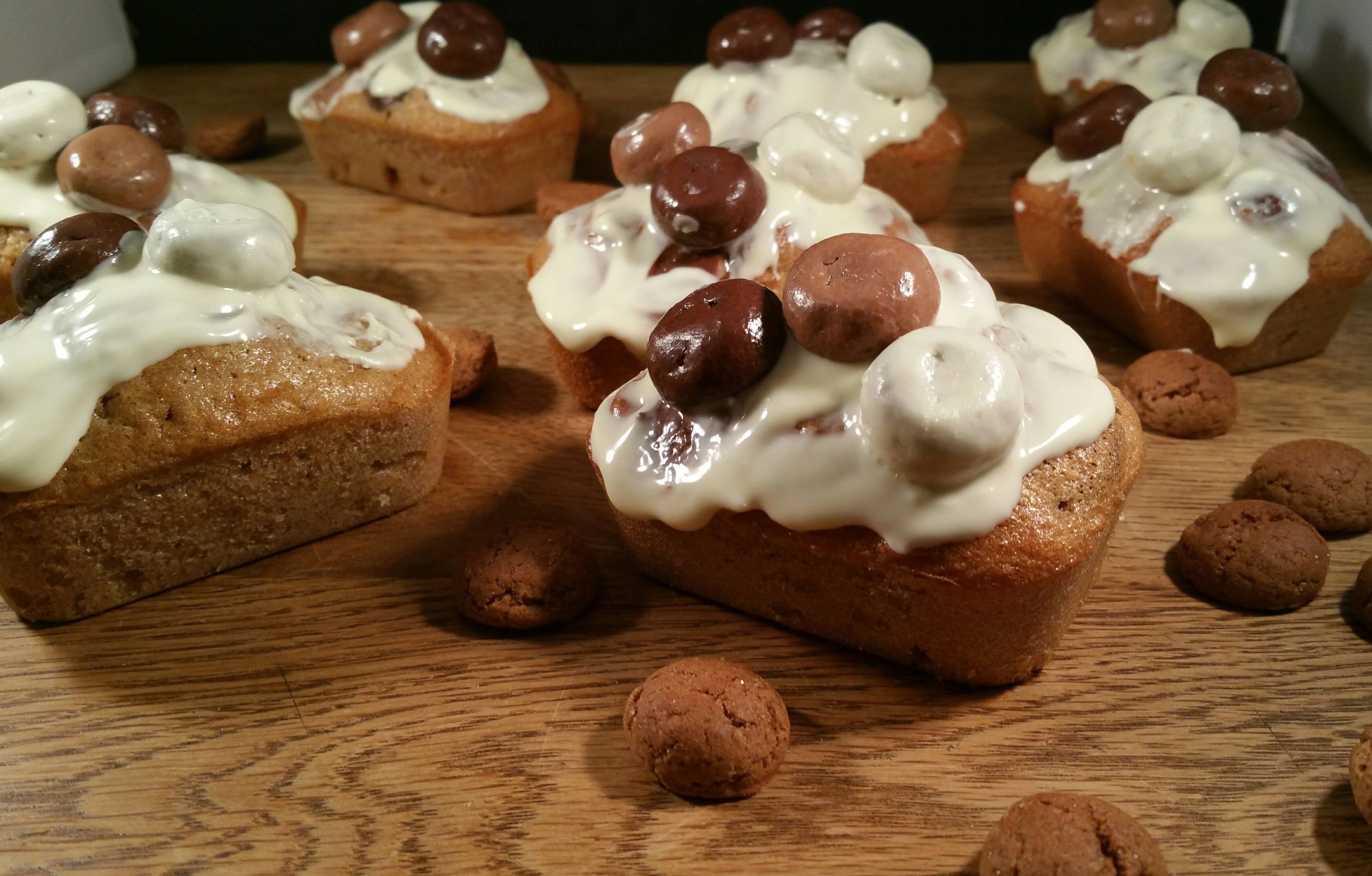 Verdeel met een lepel de gesmolten chocolade over de cakes en garneer het geheel met de achtergehouden pepernoten.