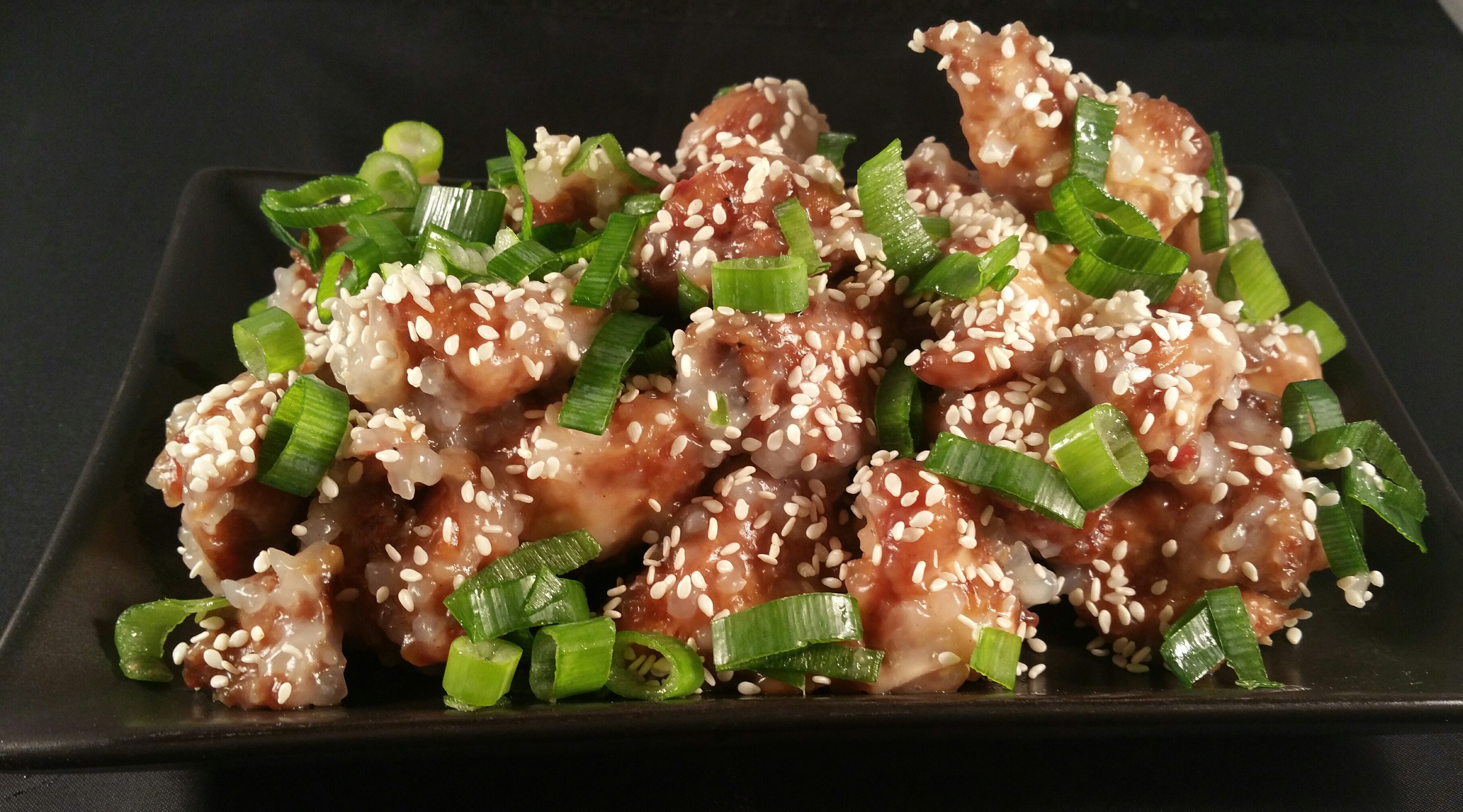 Malse gefrituurde kip stukjes in een zure plakkerige saus.